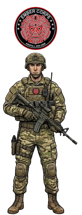 EMBER CORPS: 100 partecipanti Incursione 60% - Difesa e pattuglia 30% - LARP 10% Mimetismo: Multicam, ATACS, e mimetismi desertici. Richiesti: elmetto o basco. Vietati kefiah e baseball cap. |